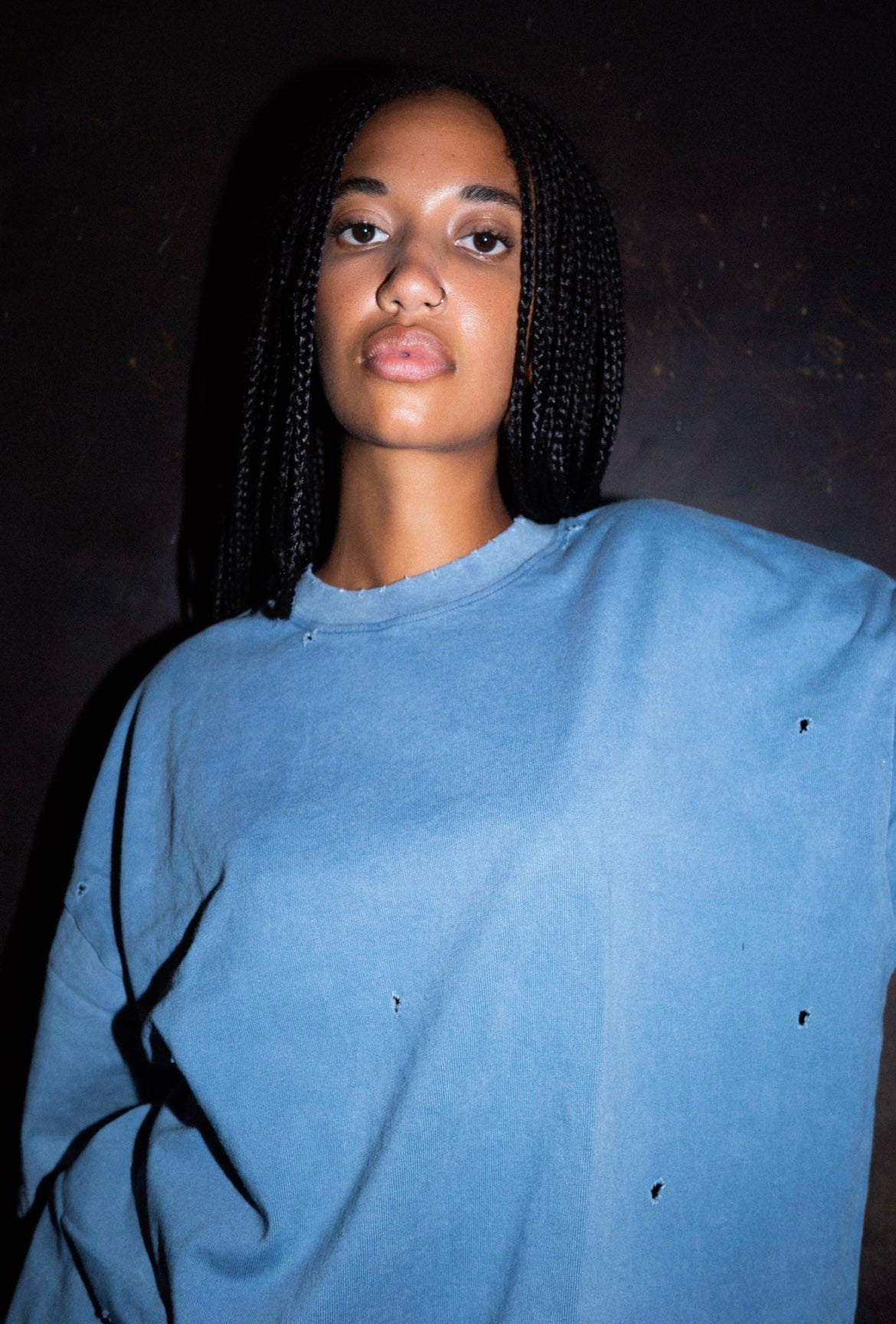 The Distressed Boxy Tee is cut from heavyweight soft cotton-jersey and finished with a vintage wash for a lived-in look. Featuring an oversized, boxy silhouette with elbow-length sleeves, this tee is detailed with hand-made holes and rips throughout, each piece revealing subtle flashes of skin and carrying its own unique character. No two are the same.