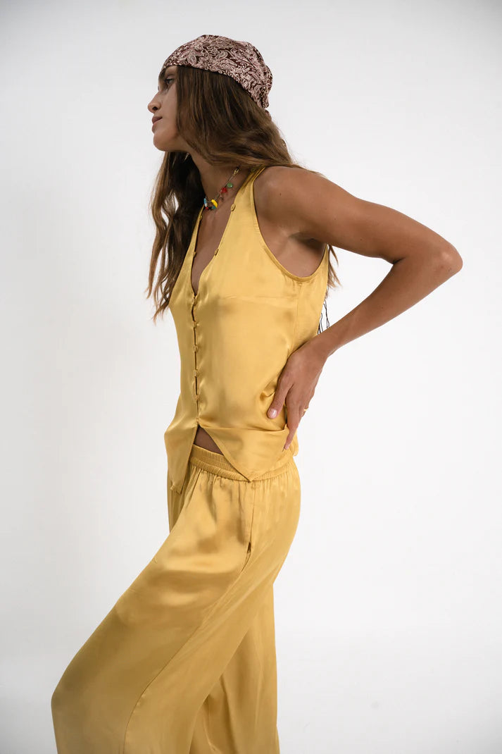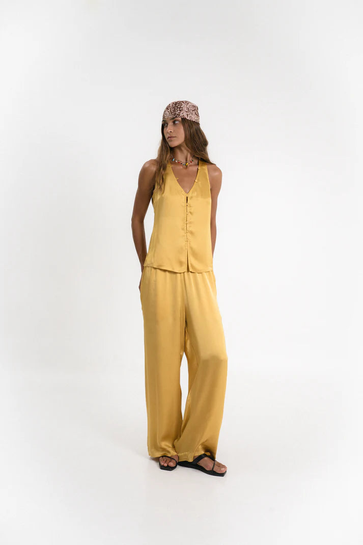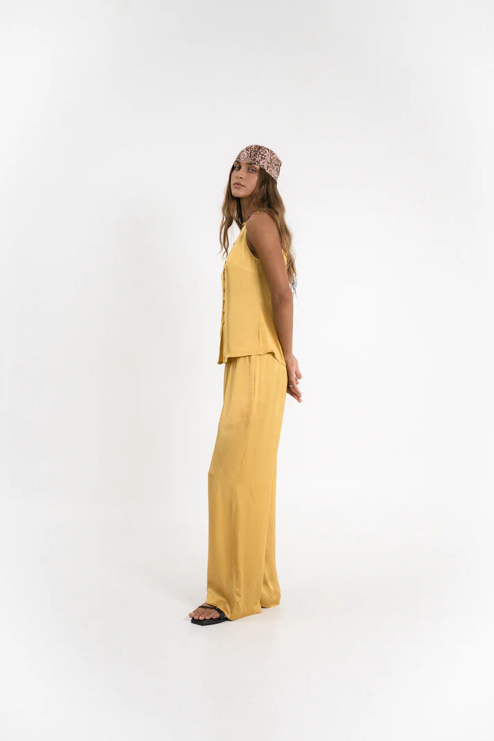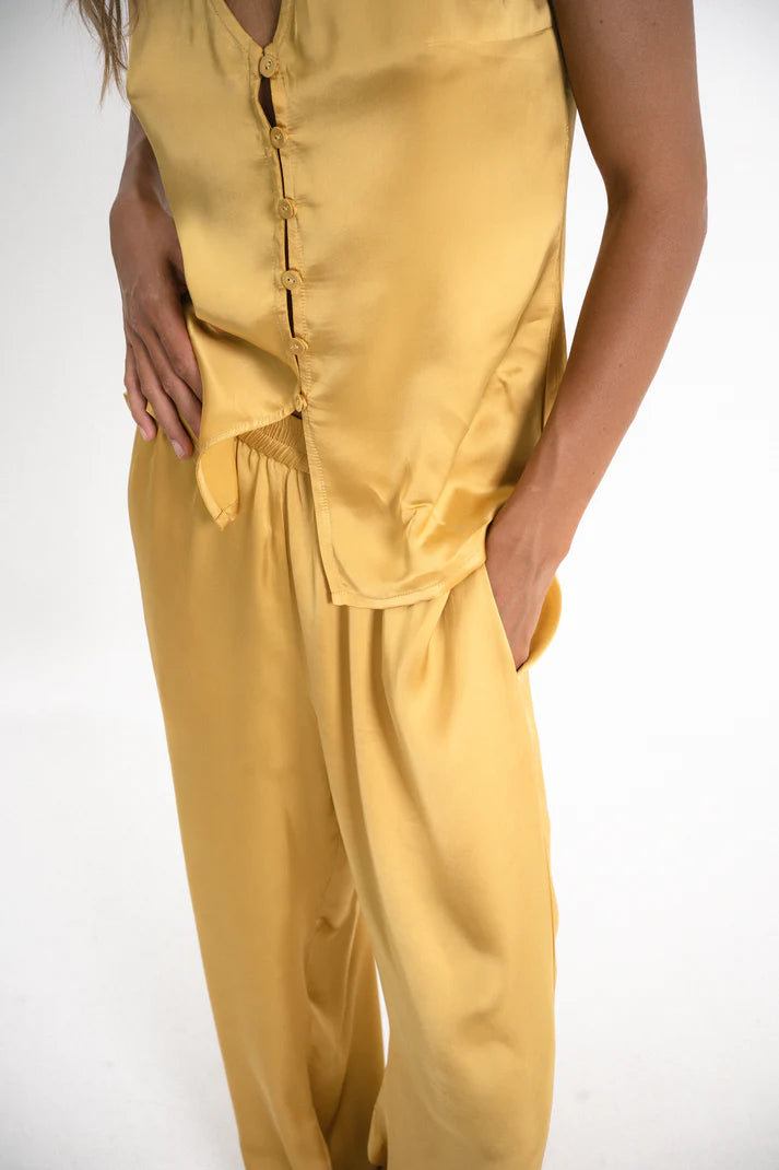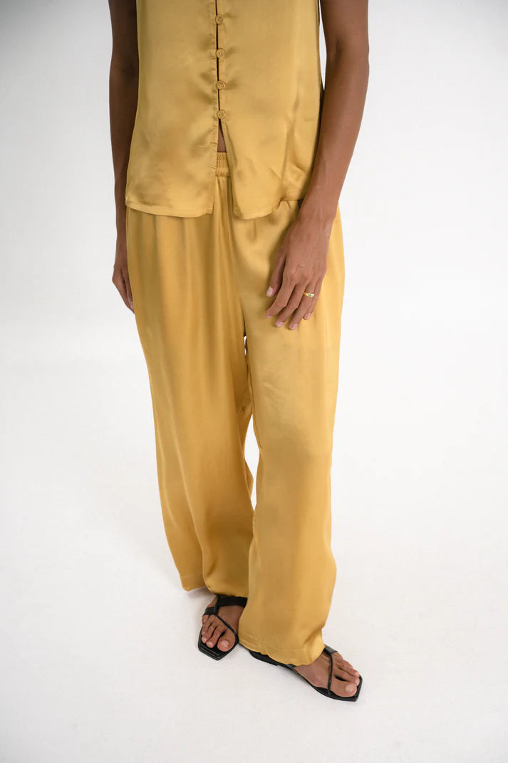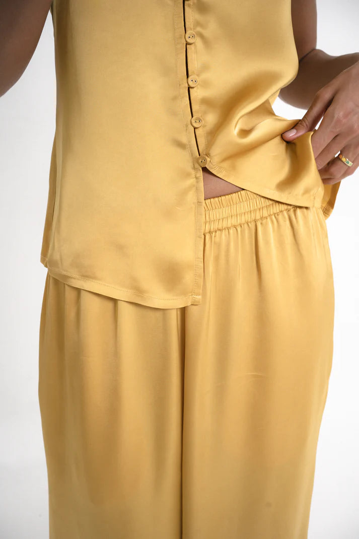 When it comes to selecting fabrics, the key factors are how they drape and feel. These pants are crafted from fluid satin viscose, which is incredibly soft and lightweight against your skin. They feature an elastic waistband and roomy wide legs. Pair them with a loose blouse or a tank top for a stylish look.
