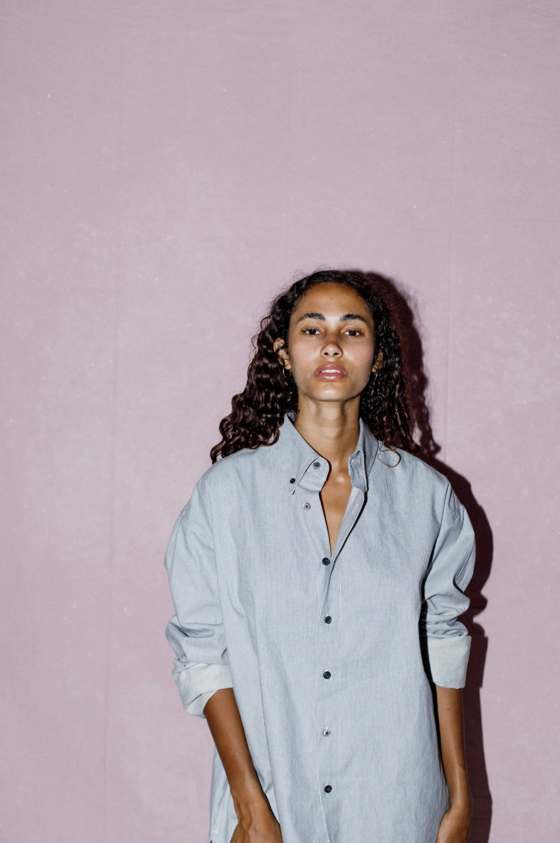 Made from lightweight cotton printed with slim navy blue thin pin-stripes, this shirt has a slightly oversized fit and a pointed collar.