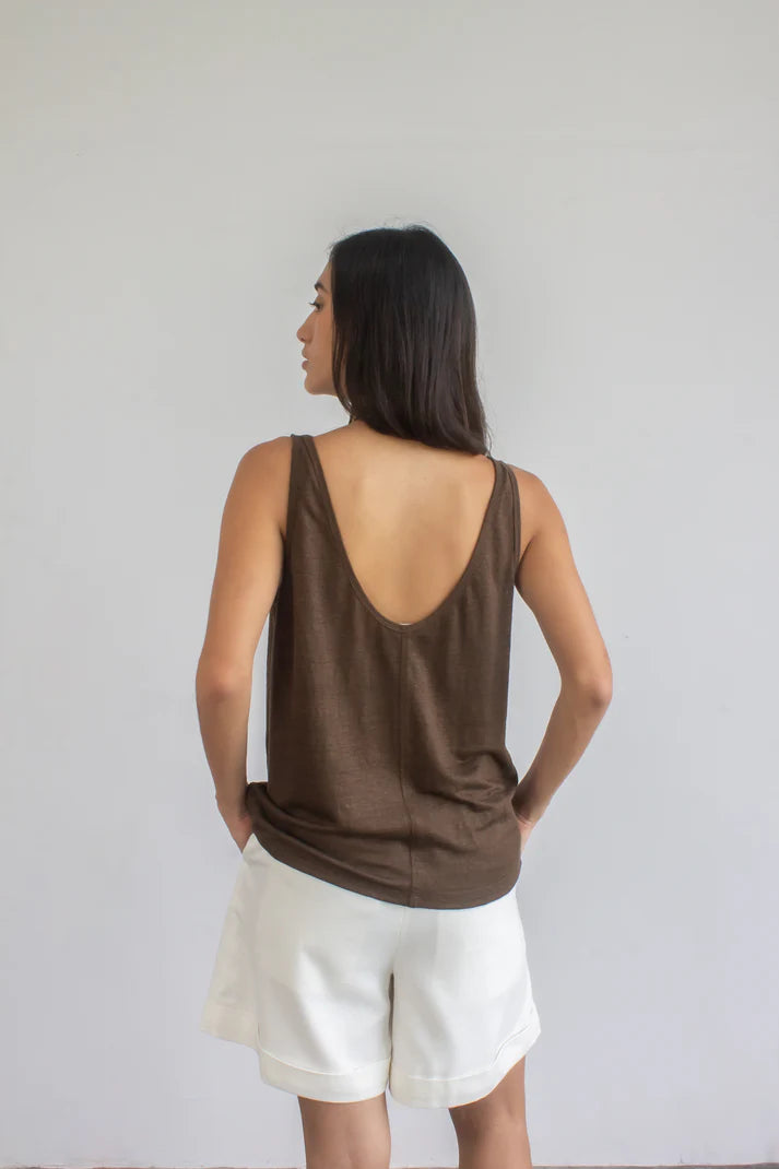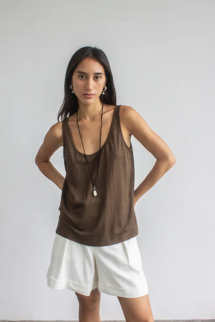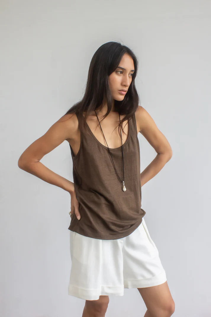 Crafted from pure linen, this loose-fit top drapes elegantly with a flattering scoop neckline and low-cut armholes. Wear it solo with our satin palazzo pants for an evening out, or pair it with classic pleated shorts for an office-ready summer look.