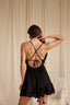 Discover effortless elegance with the IRIS sundress, a sophisticated black piece designed for warm-weather sophistication. Featuring delicate thin straps and an alluring open back, this dress showcases handcrafted floral ties—a distinctive artisanal touch. The thoughtfully engineered construction pairs a layered upper bodice for structure with a fluid single-layer skirt for graceful movement. Crafted from a breathable cotton-blend fabric (86% cotton, 11% polyester, 3% nylon), it offers comfort and durability for everyday wear and special occasions alike.