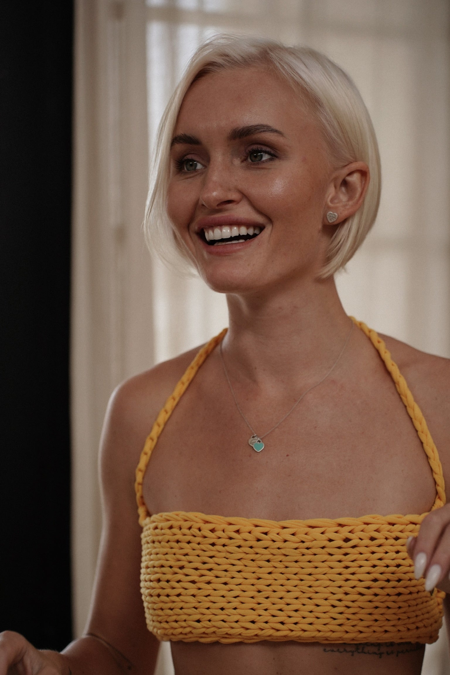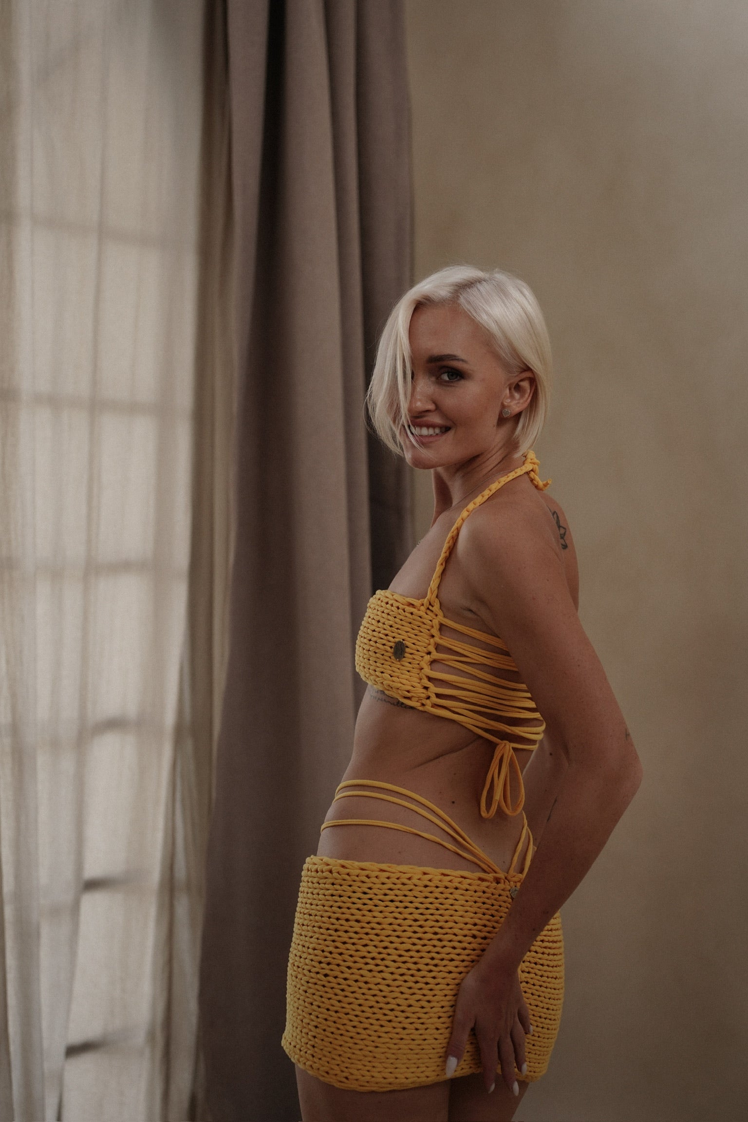 IRISSA SET YELLOW combines effortless style with thoughtful craftsmanship. This handmade two-piece set features a soft cotton top with adjustable back ties that adapt to your frame, paired with a coordinating mini skirt finished with delicate side ties. The adjustable design ensures a personalized fit, while the natural cotton fabric offers breathability and comfort for everyday wear or casual occasions.