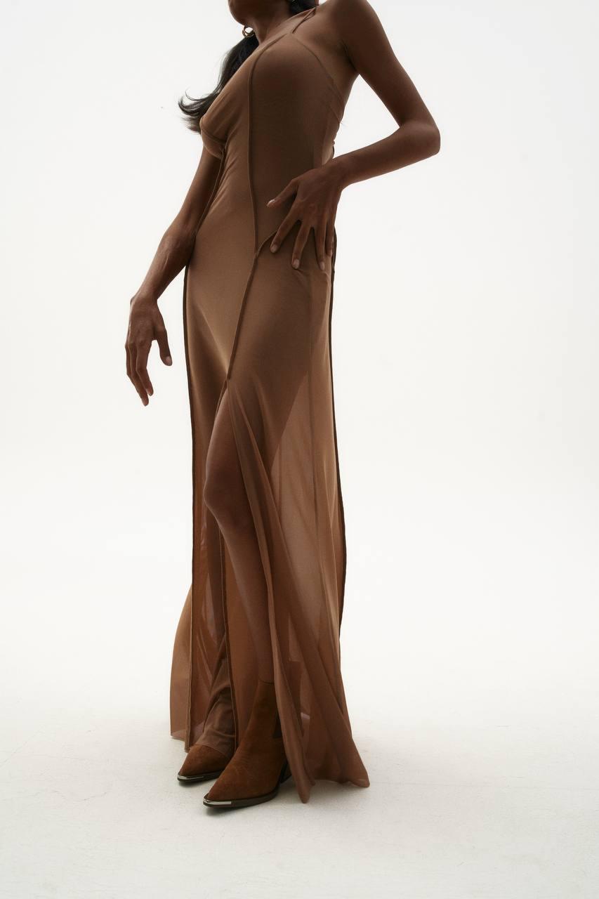 Elevate your evening wardrobe with this striking maxi dress from PAKHTUSOVA's exclusive collection. Crafted in luxurious chocolate mesh, the Miami design features a dramatic leg slit and floor-length silhouette for sophisticated movement and visual impact. The sheer mesh construction creates an alluring, contemporary aesthetic perfect for upscale events and refined occasions. Made from 100% polyester for durability and easy care. A statement piece that seamlessly transitions from cocktail hour to late-night elegance.