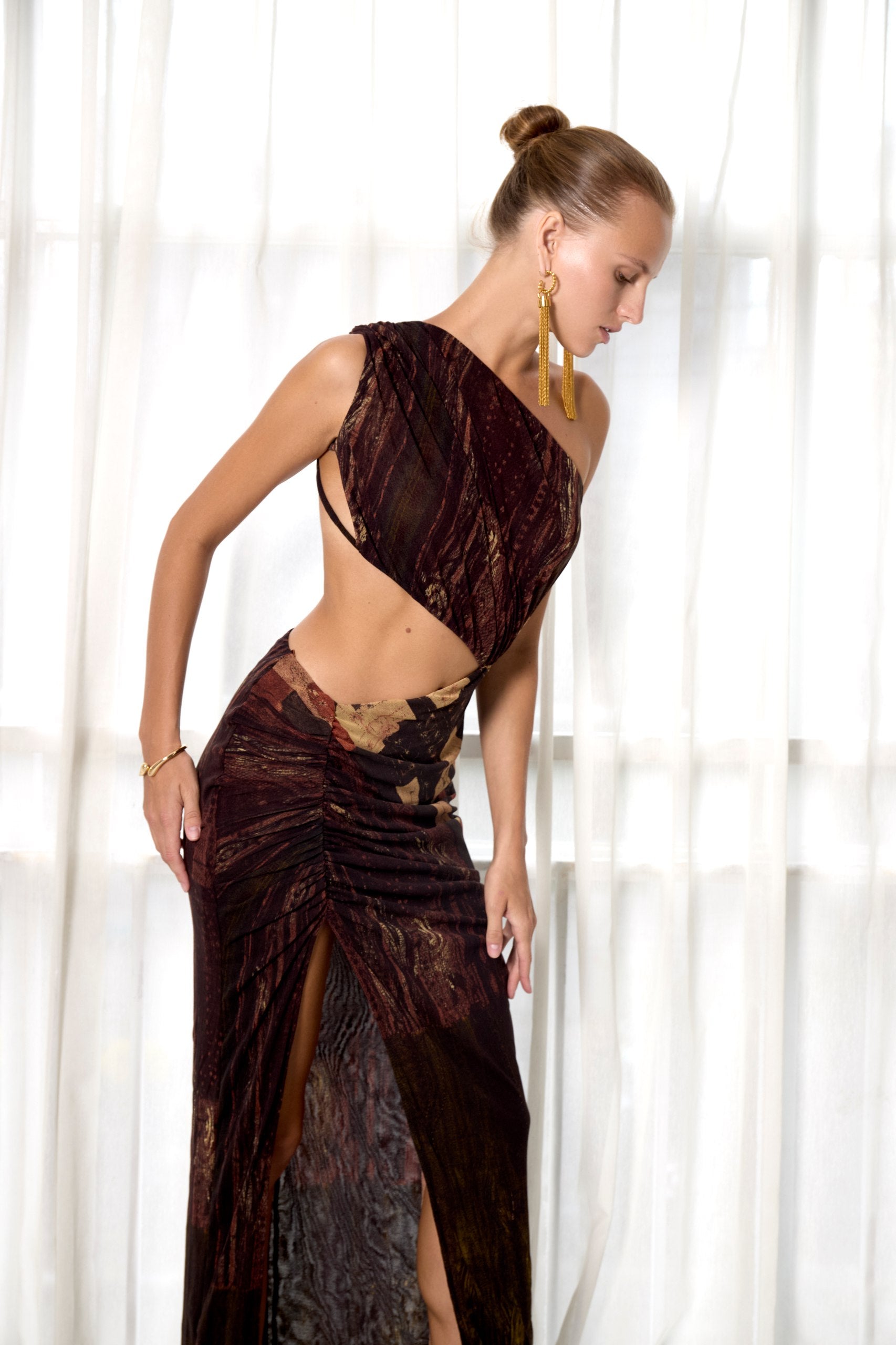 •Front Detail : Asymetric cut out on the waist with ruched details. •Neckline: One Shoulder Neckline •Back: Open back with adjustable straps •Closure: Invisible zipper on back of skirt for a seamless finish • Skirt : full Lining for smooth finish & coverage |