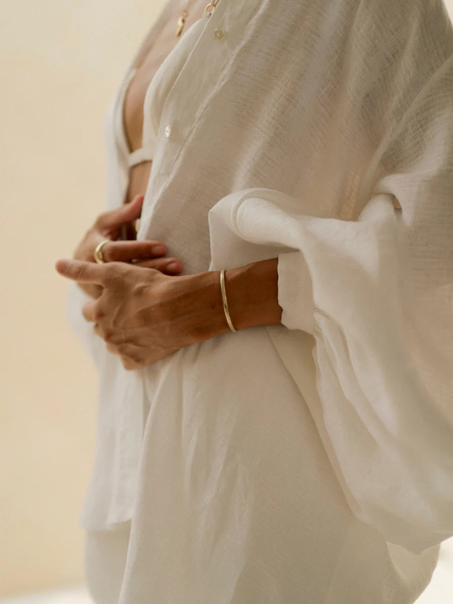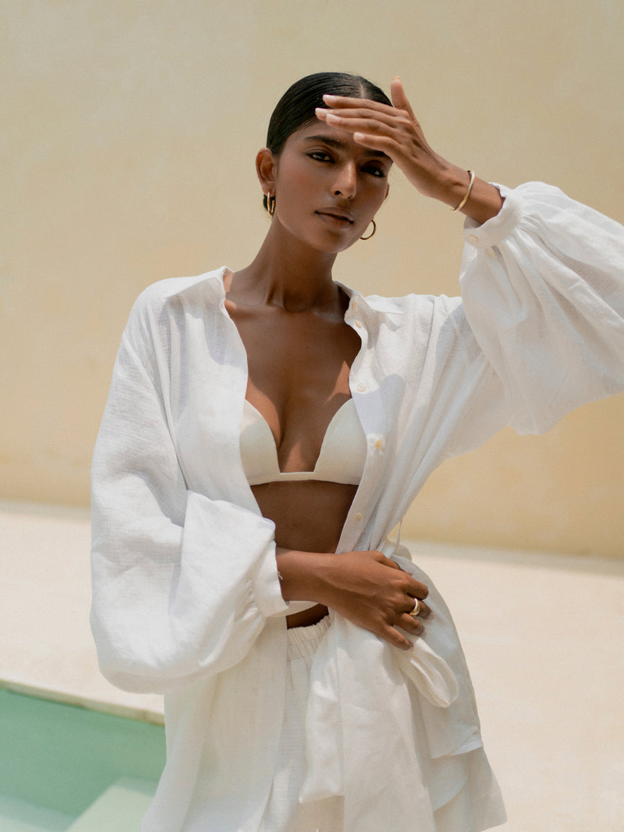 Discover effortless sophistication with our SHIRT AURA OFF-WHITE linen set. Crafted from breathable linen, this three-piece ensemble features delicate thin straps on the bra, an airy oversized shirt, and relaxed-fit pants that work together to create an understated yet sensual aesthetic. The loose silhouette offers comfort without sacrificing style, making it ideal for warm weather dressing or layered looks. Perfect for those who appreciate the intersection of ease and refinement.